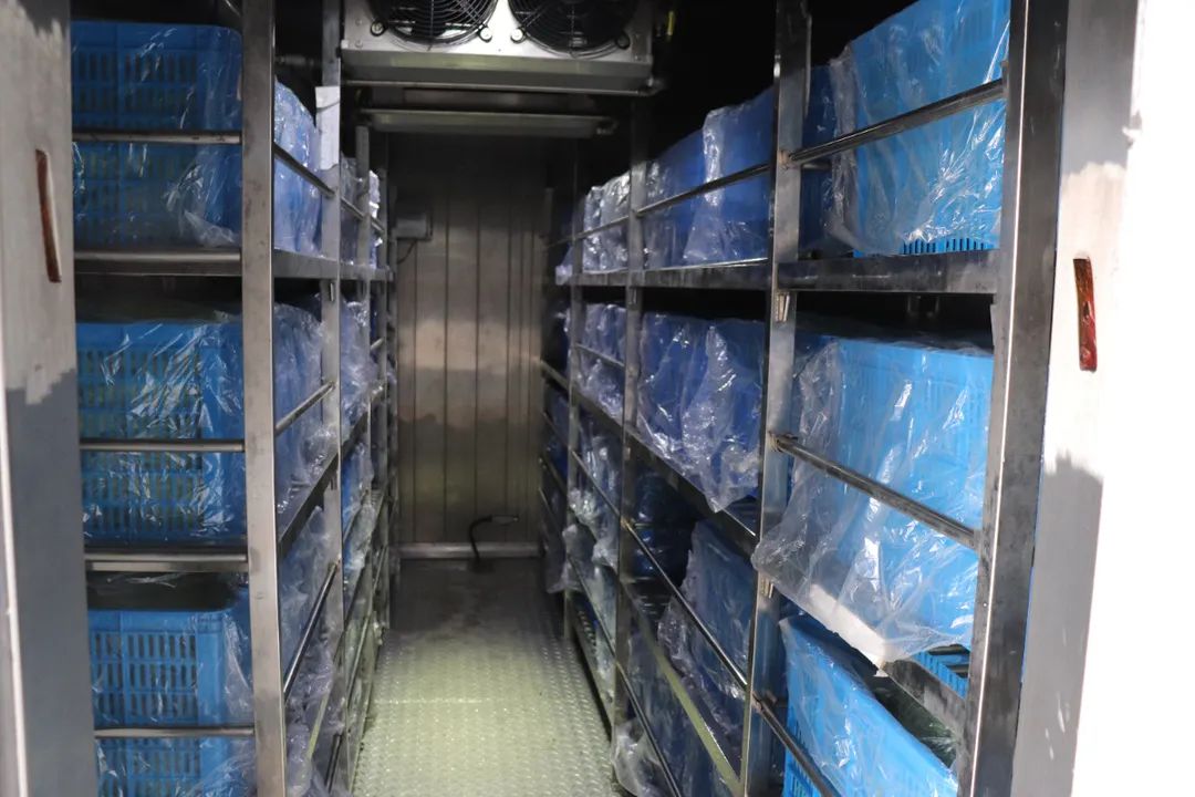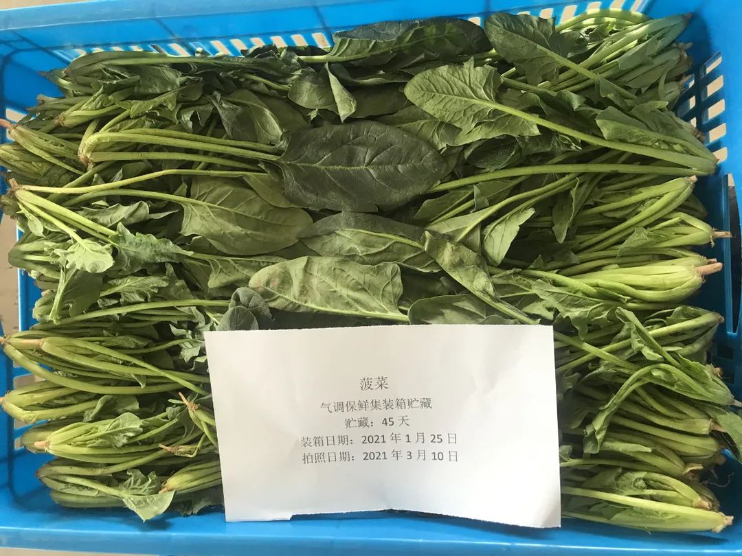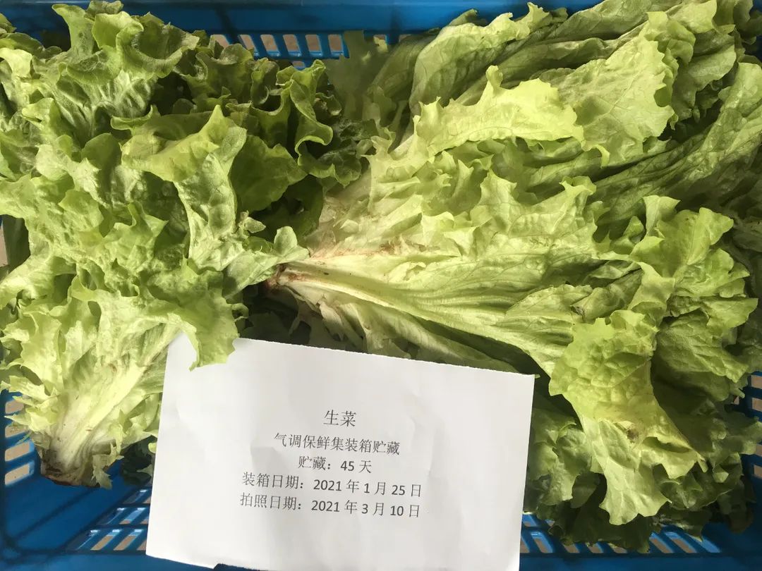 在廠內(nèi)進行技術(shù)研發(fā)固然重要,在實踐中跟蹤驗證才能將裝備性能落實好。在廠內(nèi)完成保鮮試驗后,氣調(diào)冷藏集裝箱又馬不停蹄趕往山東壽光開展蔬菜基地陸用保鮮試驗,在北方寒冬季節(jié)里,測試設備的應用工況,并作為氣調(diào)冷藏集裝箱走向大棚蔬菜保鮮的一次前期基礎性工作,全程跟蹤設備運行及試驗情況。2021年1月25日~3月11日,在貯藏45天后,除西蘭花、花椰菜、小白菜外,生菜、菠菜、油麥菜、上海青4種菜品,幾乎仍保持著剛?cè)霂鞎r的新鮮狀態(tài),失重率及折損率均不大于10%及15%。能達到此保鮮效果,也與基地果蔬好的品種與品質(zhì)有關。